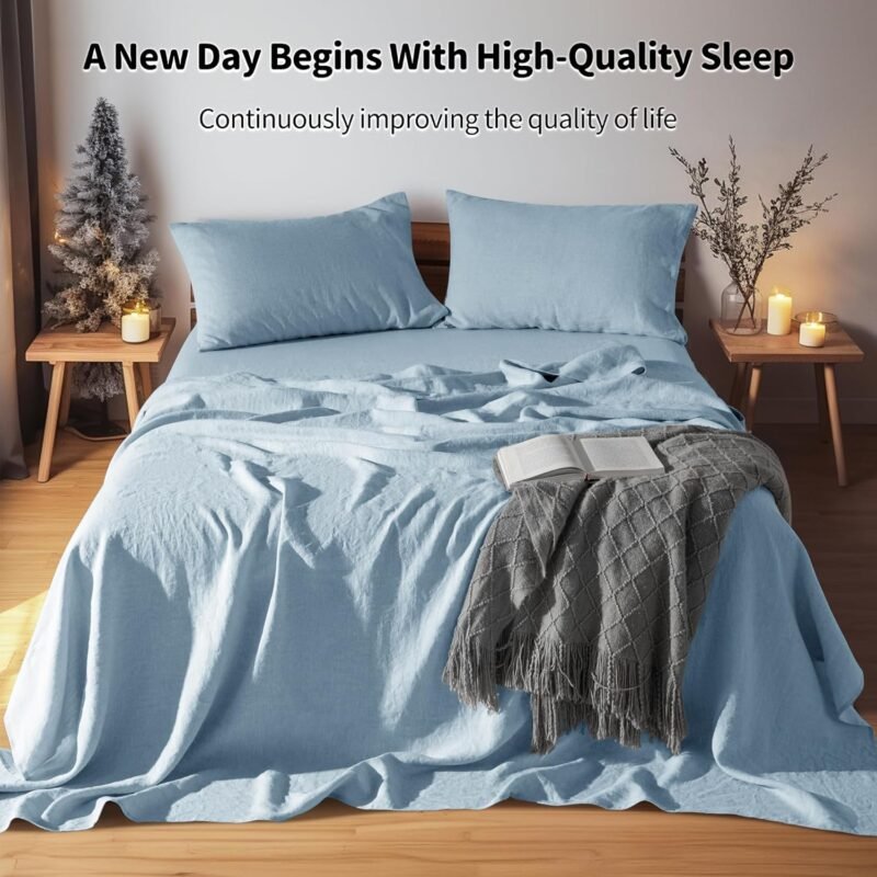 100% Linen Sheet Set King Size,Bed Sheets 4 Piece Sets,Solid Color Natural Flax Bed Sheets Soft Breathable Bedding,16″ Deep Pocket,All Season (King, Dusty Blue)