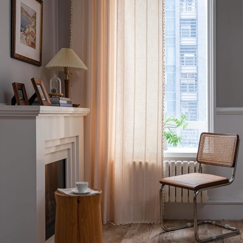 Beige Boho Curtains for Bedroom, Semi Blackout Linen Farmhouse Shabby Chic Tassels Window Treatment Bohemian Embroidery Drape for Halloween Decor, Rod Pocket 1 Panel 52″ W x 84″ L