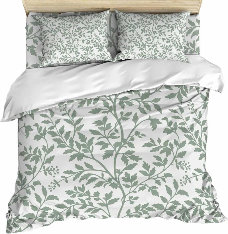 Green Botanical Comforter Cover , Vintage Leaf Pastoral Rustic 4 Piece Bedding Set with Zipper Closure All Season Duvet Cover for Child Girls Boys, Breathable, Soft