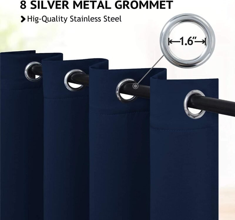 Package Includes:Set of 2 window Panels. each panel measuring:52 W by 84 L for a total size of 104 W x 84 L.Each pair of sun block curtains has 8 silver metal grommets on top. Each grommet inner diameter is 1.6 inch, comparable with most rods. Easy to hang, and slide smoothly.