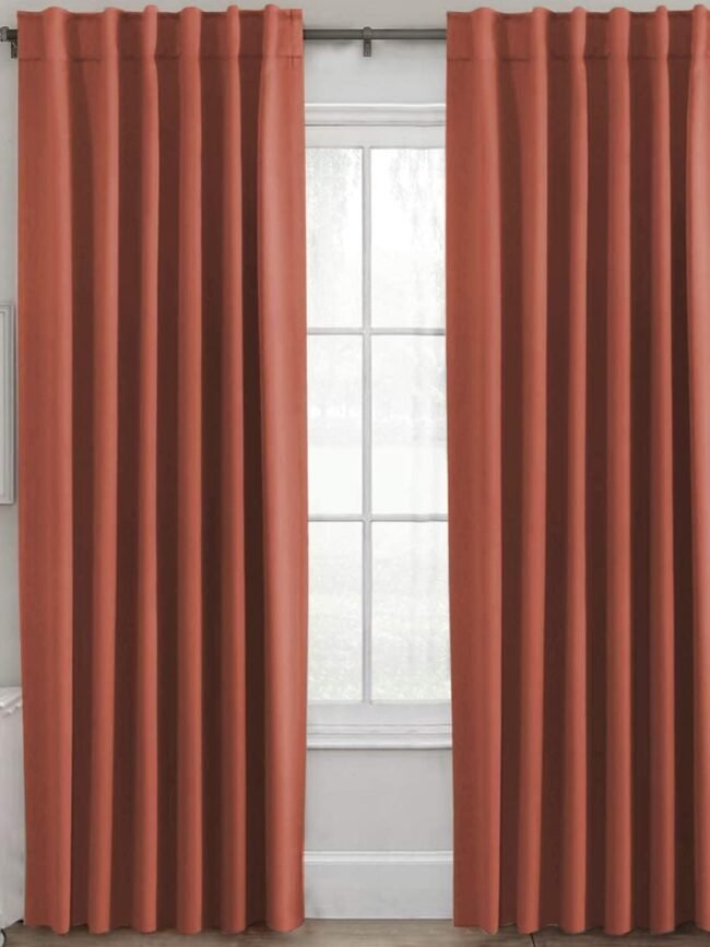 - READY MADE: 2 Burnt Orange Linen Curtain Panels per package.Each panel measures 52 inches wide by 84 inches long. Top design of Back tab & loop pocket provide 3 hanging options. <1> hanging from the back patch to create an elegant pleated look, <2> from the 3 inch rod pocket for a classic look <3> Hanging with clip rings for easy, slide open and closed (clip rings are not included)