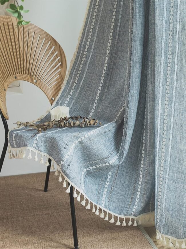 Boho Curtains 84 Inches Long for Bedroom Living Room,Semi-Blackout French Country Linen Embroidery Vintage Chic Tassels Hollow Window Treatment Bohemian Drape, 1 Panel 52″ W x 84″ L, Blue