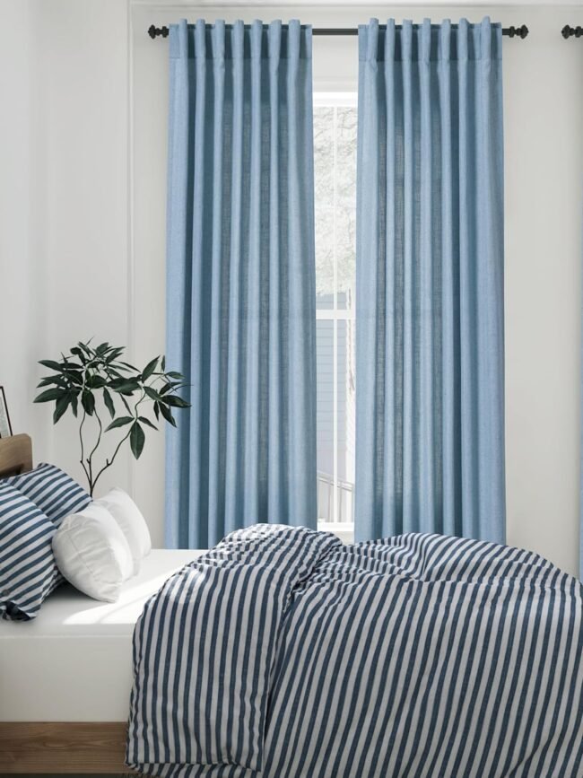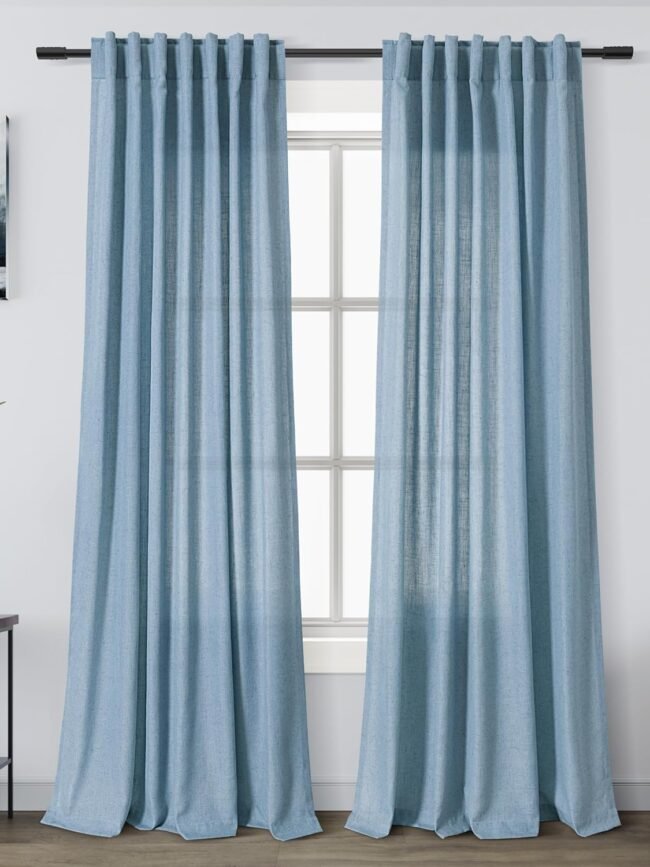 - LINEN BLEND FABRIC: Crafted from rich flax linen fabric blended with polyester featuring a neutral linen shade, those blue curtain panels are more textured than normal sheers and showcase an casual and natural look. Soft touch feeling on these elegant linen blend draperies add an rustic classic and refreshing charm to your window