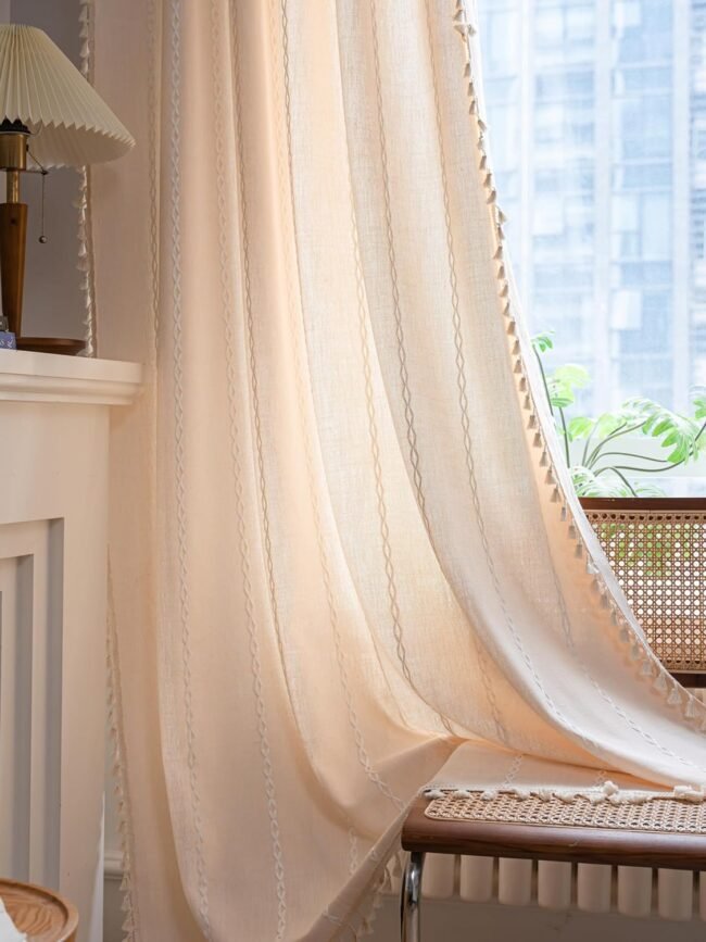 Beige Boho Curtains for Bedroom, Semi Blackout Linen Farmhouse Shabby Chic Tassels Window Treatment Bohemian Embroidery Drape for Halloween Decor, Rod Pocket 1 Panel 52″ W x 84″ L