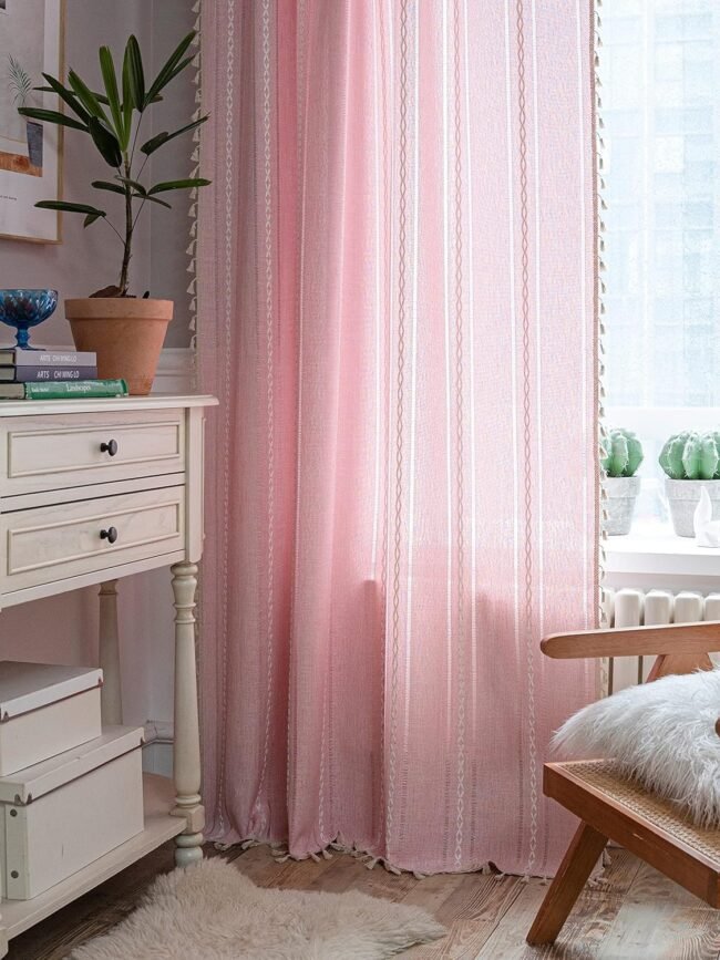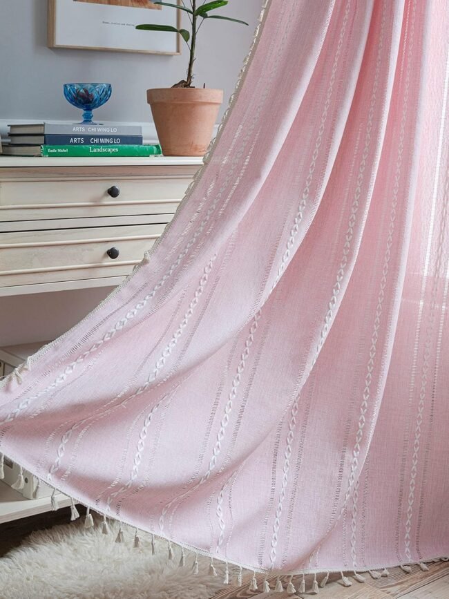 Boho Curtain for Bedroom Living Room Nursery Kitchen, Light Filtering Country Farmhouse Vintage Chic Tassels Hollow Window Treatment Bohemian Drape, 1 Panel 52″ W x 84″ L, Pink